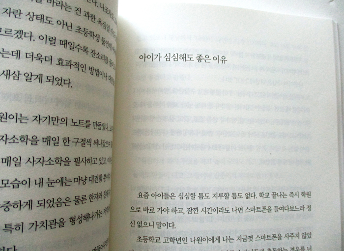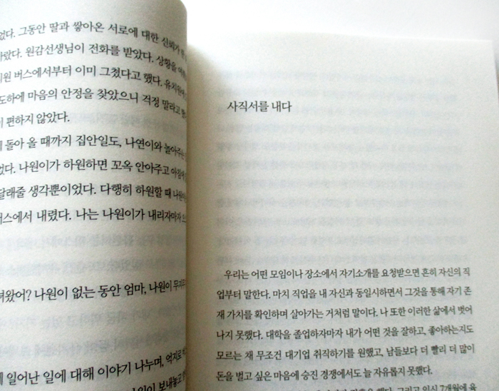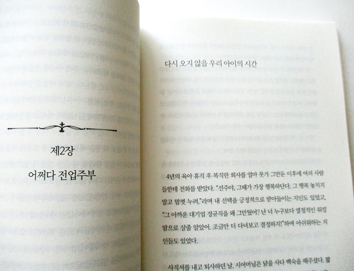 나는 며칠 동안 복잡해 폭발하기 일보직전이던 머리를 정리할 시간을 갖은 뒤 직장에 과감하게 사직서를 냈다. 그 날부터 백수가 되었다. 아니 완전한 자유인이 되었다고 하자. 남편은 가끔 아니 자주, 백수이면서 자유인인 나를 무척이나 부러워한다. 아마 내가 선택한 결과에 한 번도 후회한 적이 없어서 더 그럴 테지. 세상 무엇보다 소중한 내 아이와 함께 보내는 시간은 애초에 대기업타이틀과 바꿀 수 있는 것이 결코 아니었다_54.