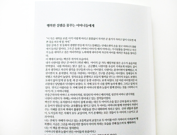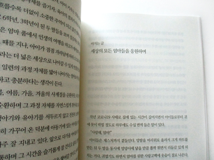 자연이 봄, 여름, 가을, 겨울의 사계절을 순환하듯, 나도 엄마로서의 사 계절을 잘 순환하며 그 과정 자체를 자연스럽게 겪어내고 싶다. 지금껏 아 이들의 신생아기와 유아기를 서두르지 않고 천천히 소박하지만 매일의 일상을 소중히 가꾸어 온 덕분에 아동기에 있는 아이들은 자신들의 날개를 펼치며 아주 잘 지내고 있다. 앞으로 다가올 아이들의 청소년기 역시 따뜻하게 소통하며 그 시간을 슬기롭게 잘 건너고 싶다. 건강하고 행복한 하루하루가 모여 아이들과 신뢰는 더욱 쌓여갈 것이고, 아이들 역시 행복 하고 건강하게 성장해나갈 것이다. 아이들에게 우주와 같은 존재인 엄마로서의 삶은 이미 그 자체로 의미 깊고 충만하니 무엇을 더 바라겠는가!_234