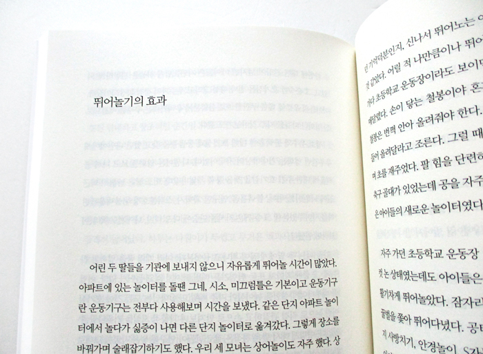 아이들과 함께 즐겁게 노는 것은 결코 어려운 일이 아니다. 나 역시 아 동기를 거쳤고, 그 시절 고무줄놀이, 술래잡기, 얼음땡, 말뚝 박기 등 다양 한 놀이에 푹 빠져 엄마가 저녁 먹으러 들어오라고 부를 때까지 놀기 바빴 다. 어른이 되었다고 그 재미를 느낄 수 없게 된 것이 전혀 아니었다. 그때를 떠올리며 다시 그 시절로 돌아가, 또래 친구 대신 아이들과 뛰놀면 되 는 것이었다. 생각보다 그리 어렵지 않다._212
