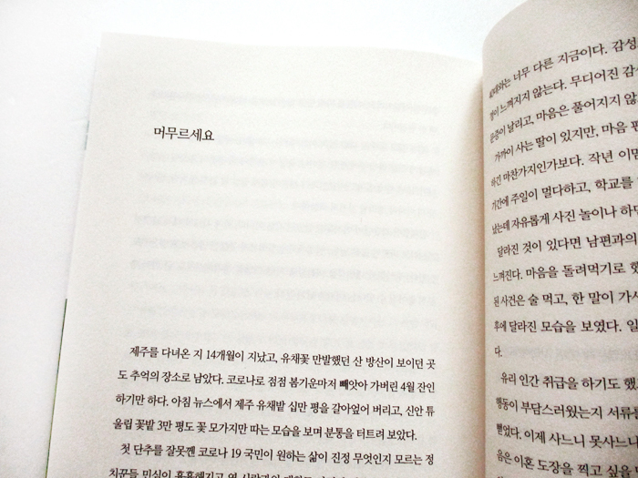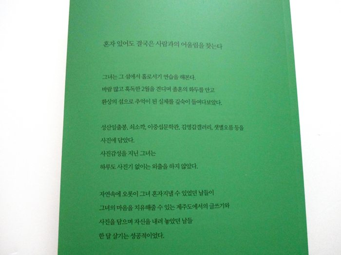 자연속에 오롯이 그녀 혼자지낼 수 있었던 날들이 그녀의 마음을 치유해줄 수 있는 제주도에서의 글쓰기와 사진을 담으며 자신을 내려놓았던 날들 한 달 살기는 성공적이었다.