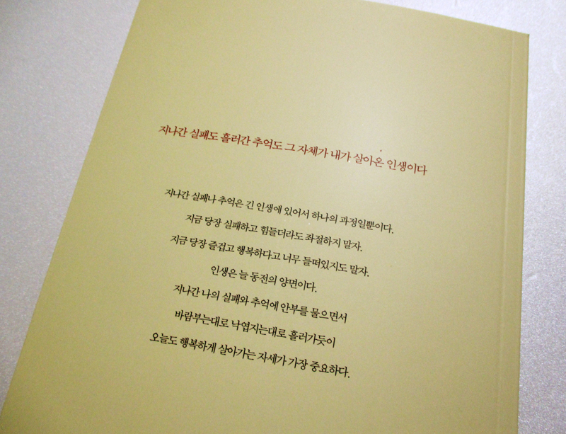 아마도 사람들 대부분이 ‘실패’라는 단어를 들으면 피하고 싶고, 외면하고 싶은 게 사실이다. 실패하면 그 시점엔 정말 죽을 것처럼 힘들고 우울하다. 나는 그 정도가 더 심했다. 그러나 한번 실패했다고 영원히 실패한 것은 아니다. 꼭 성공했다고 거기서 배우는 것보다 오히려 실패를 통해 그 안에서 또 극복하는 과정에서 배울 수 있는 것이 더 많다고 생각한다. 만약 오늘 실패한 일이 있었다면 곰곰이 그 안에서 무엇을 배울 수 있는지 한번 생각해보길 바란다._33