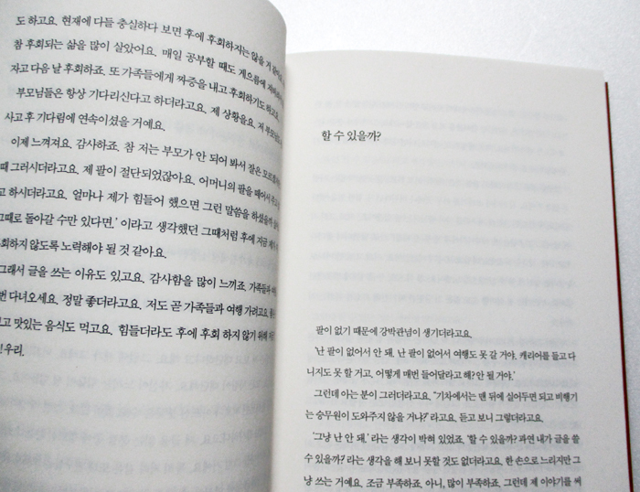 저는 사실 한쪽 팔이 없는 장애인입니다. 지체 2급 장애인이지요. “한쪽 팔로 어떻게 글을 쓰느냐?” 라고 하는데 썼습니다._7