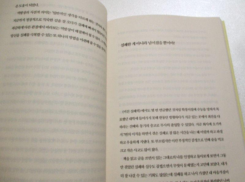 아마도 사람들 대부분이 ‘실패’라는 단어를 들으면 피하고 싶고, 외면하고 싶은 게 사실이다. 실패하면 그 시점엔 정말 죽을 것처럼 힘들고 우울하다. 나는 그 정도가 더 심했다. 그러나 한번 실패했다고 영원히 실패한 것은 아니다. 꼭 성공했다고 거기서 배우는 것보다 오히려 실패를 통해 그 안에서 또 극복하는 과정에서 배울 수 있는 것이 더 많다고 생각한다. 만약 오늘 실패한 일이 있었다면 곰곰이 그 안에서 무엇을 배울 수 있는지 한번 생각해보길 바란다._33