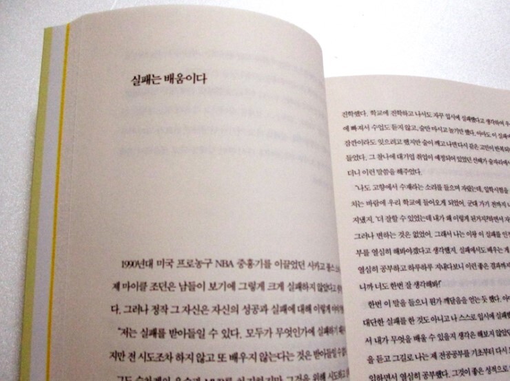 아마도 사람들 대부분이 ‘실패’라는 단어를 들으면 피하고 싶고, 외면하고 싶은 게 사실이다. 실패하면 그 시점엔 정말 죽을 것처럼 힘들고 우울하다. 나는 그 정도가 더 심했다. 그러나 한번 실패했다고 영원히 실패한 것은 아니다. 꼭 성공했다고 거기서 배우는 것보다 오히려 실패를 통해 그 안에서 또 극복하는 과정에서 배울 수 있는 것이 더 많다고 생각한다. 만약 오늘 실패한 일이 있었다면 곰곰이 그 안에서 무엇을 배울 수 있는지 한번 생각해보길 바란다._33