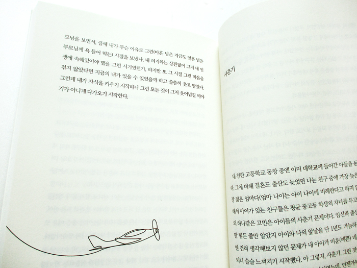 남편은 소위 ‘아들 바보’가 되기 시작했다. 그저 틈만 나면 물고 빨려고 들고 아이가 웃든 울든 아이 기분은 상관없이 그저 혼자 웃고 끌어안고 좋아했다. 말 그대로 아이를 바라보는 눈에서 꿀이 떨어진다. 말 그대로 아이가 좋아 죽는다. 말 그대로 세상 태어나 처음 해보는 사랑처럼 아이를 사랑하는 것 같았다._176