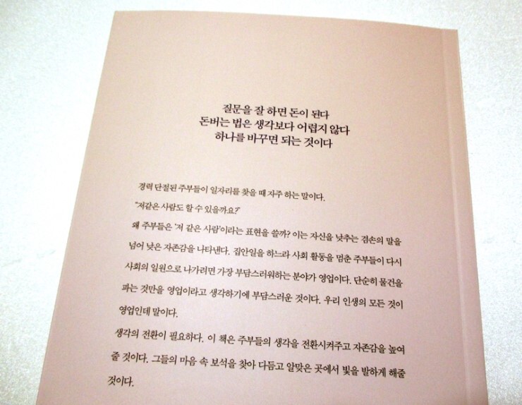왜 주부들은 ‘저 같은 사람’이라는 표현을 쓸까? 이는 자신을 낮추는 겸손의 말을 넘어 낮은 자존감을 나타낸다.집안일을 하느라 사회 활동을 멈춘 주부들이 다시 사회의 일원으로 나가려면 가장 부담스러워하는 분야가 영업이다. 단순히 물건을 파는 것만을 영업이라고 생각하기에 부담스러운 것이다. 우리 인생의 모든 것이 영업인데 말이다.