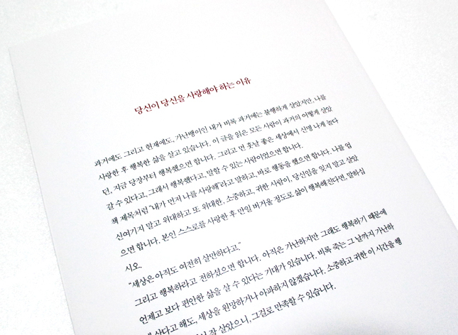 책 제목처럼 “내가 먼저 나를 사랑해”라고 말하고, 바로 행동을 했으면 합니다. 나를 업신여기지 말고 위대하고 또 위대한, 소중하고, 귀한 사람이, 당신임을 잊지 말고 살았으면 합니다. 본인 스스로를 사랑한 후 만일 버거울 정도로 삶이 행복해진다면, 말하십시오.