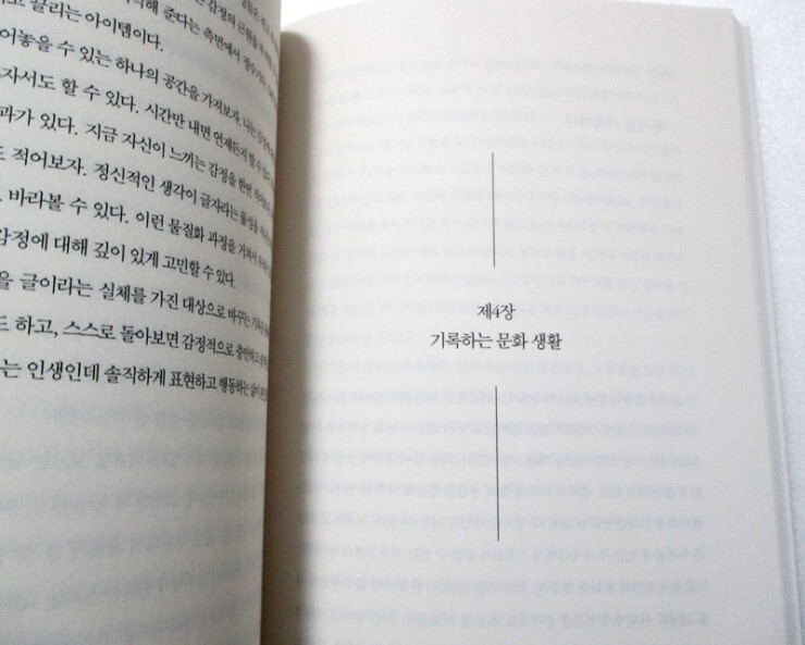 지금 자신이 느끼는 감정을 한번 적어보자. 자신의 상황이나 고민도 적어보자. 정신적인 생각이 글자라는 물성을 지니는 순간 우리는 객관적으로 바라볼 수 있다. 이런 물질화 과정을 거쳐서 우리는 감정을 측정할 수 있고, 감정에 대해 깊이 있게 고민할 수 있다._144