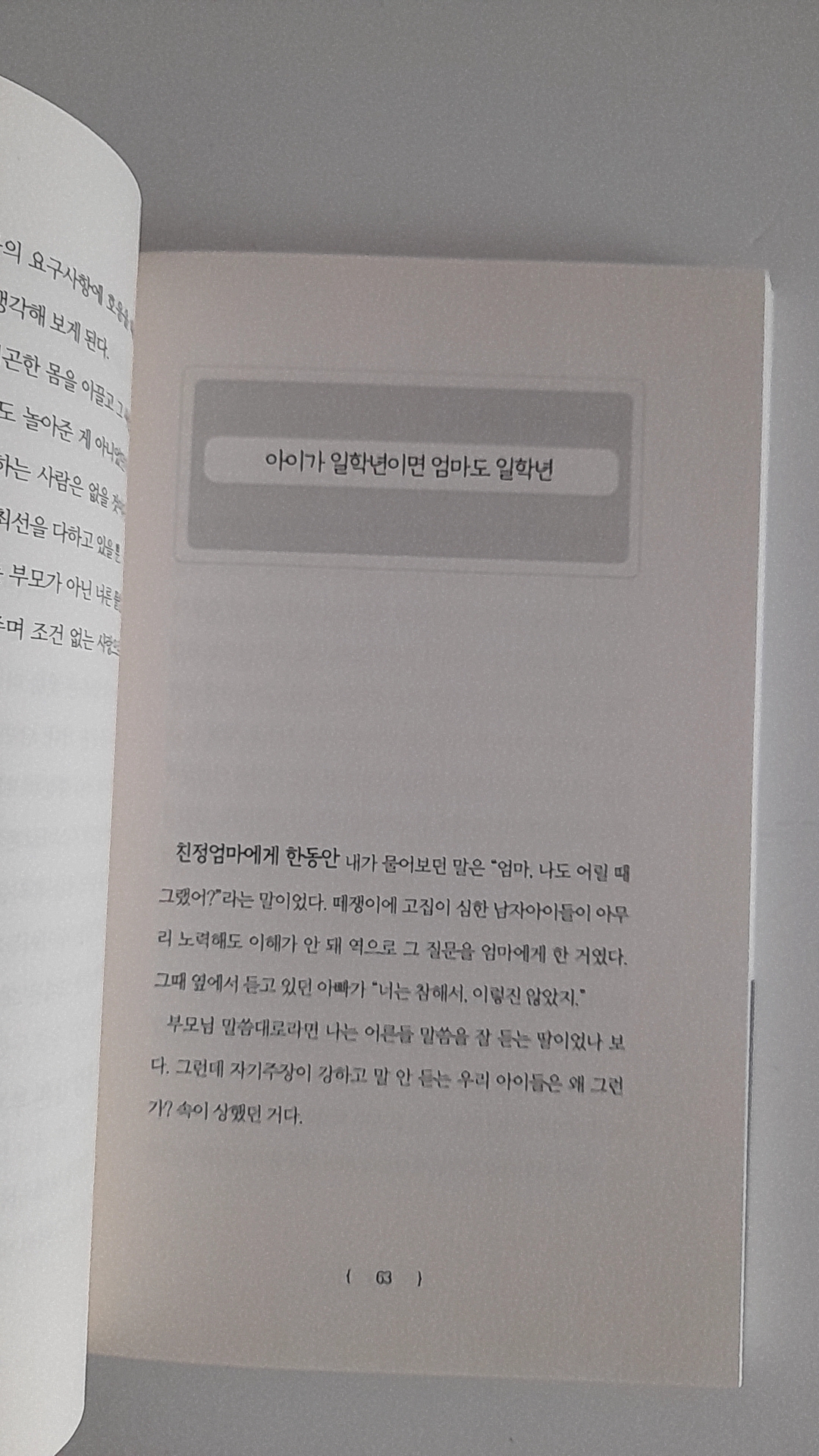 이 당시 무엇이 문제였던가를 생각해 보면 남편이나 엄마인 내가 부모로서의 역할이 아닌 아이와 같은 눈높이에서 화를 내고 있다는 거였다. 우리가 부모로서의 역할로 아이를 대하지 않고 아이의 눈높이에서 같이 화를 다루고 있다는 거, 부모의 눈높이는 아이가 화를 내면 저 아이가 화가 났구나를 읽어주어야 교육인데 아이와 똑같이 나도 화를 내면 내 역할에서 실패한 거였다. 그걸 인식한 후에 내가 부드럽게 말을 하면서 아이도, 남편도 부드러워지고 그래서 나는 역할의 중요성이 부모로서 얼마나 큰지 배우게 됐다._92