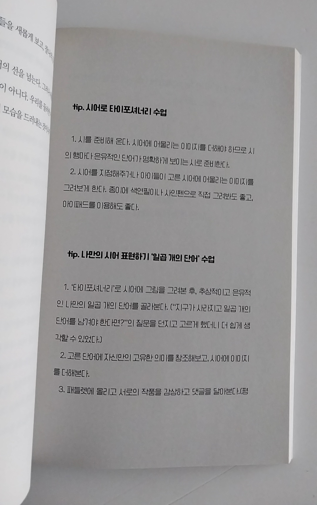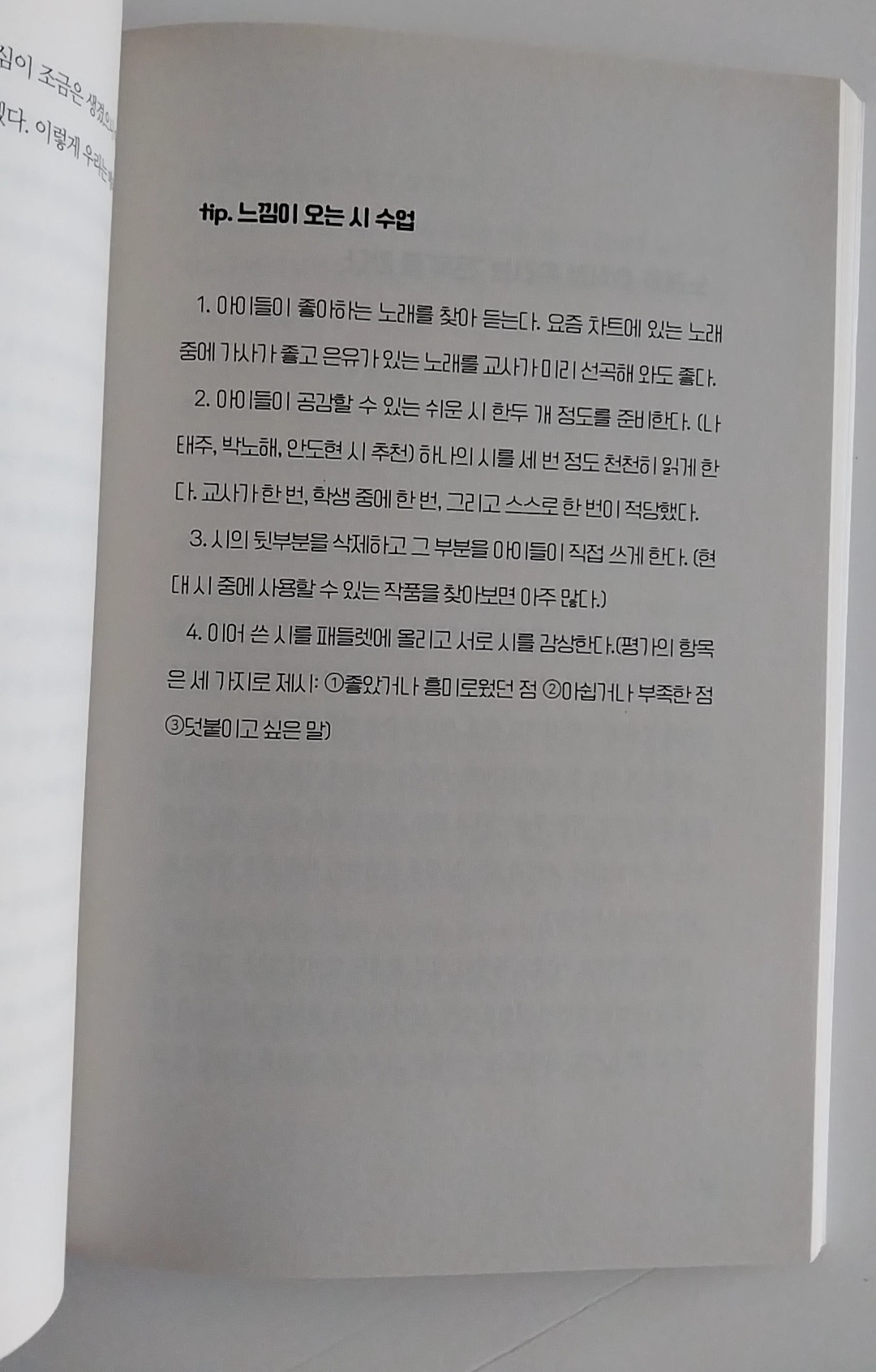 아이들은 들을 준비도 쓸 준비도 이미 되어있다. 교사는 제시된 팁들을 이모저모 필요한 만큼 잘라내어 사용하면 된 다. 이 책은 아이들이 ‘즐겁게 글을 읽고 쓰는 수업’을 이론이 아닌 경험을 통해 제시한다.