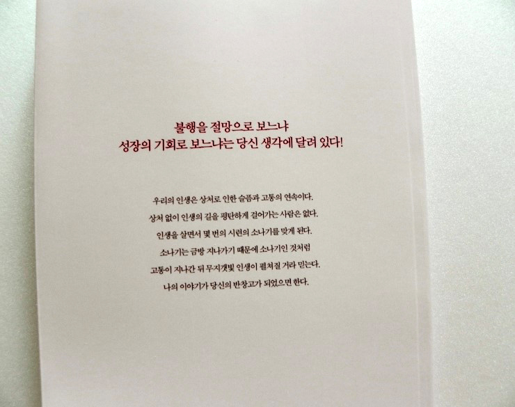 인생이 어려운 일을 만났을 때 한 발짝 물러서서 바라볼 수 있어야 한다. 고난을 고난으로 바라보지 말아야 한다. 고난을 고난이라고 인정하는 순간부터 고통이 된다. 고난은 영원하지 않다. 지금 힘든 당신이라면 용기를 가졌으면 좋겠다. 나의 삶 이야기를 통해 다시 웃을 날이 올 거라는 희망을 품었으면 좋겠다.--- p.200