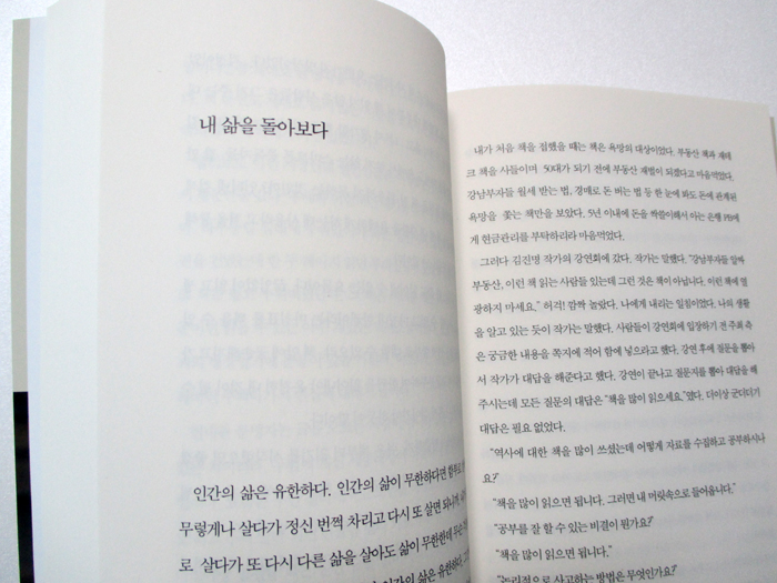 평생의 동반자로 하나를 꼽으라면 그녀는 주저하지 않고 책이라고 말한다. 그녀의 인생에 들어와 속삭이며 제대로 인생을 살라고 충고해 주는 하나뿐인 스승이요, 연인이요, 친구다.