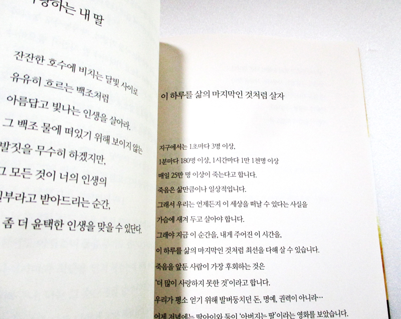 길면 100년 결국 모두 흙으로 돌아갈 존재이기에 내가 만난 소중한 존재에게 사랑을 다 주기에도 아까운 시간, 후회 없이 사랑하는 삶을 살 수 있기 위해서는 꼭 이 책을 읽을 필요가 있다.