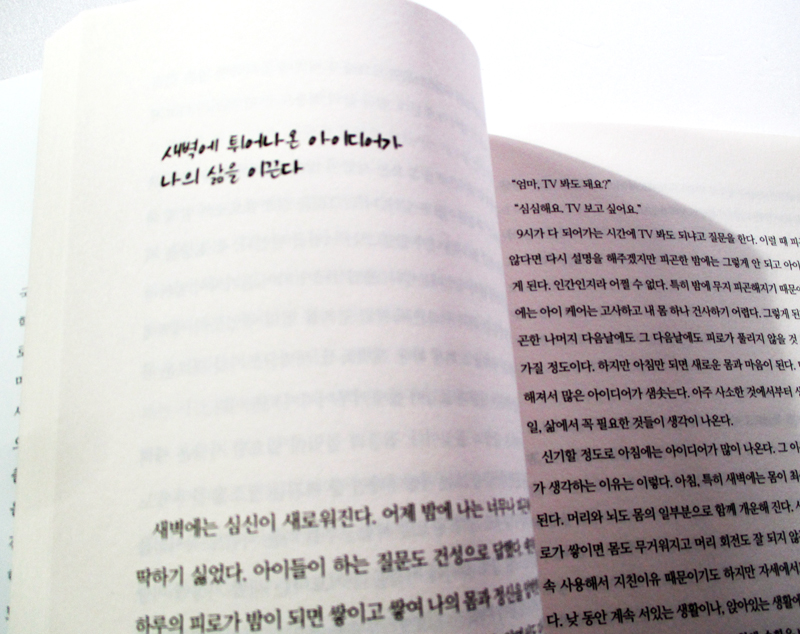 새벽에 이런 생각지도 않은 영감들을 자주 얻게 된다. 왜냐하면 새벽에는 고요하고 만큼 집중이 되기 때문이다. 새벽의 다른 이름은 집중과 몰입이라고 나는 표현하다. _175