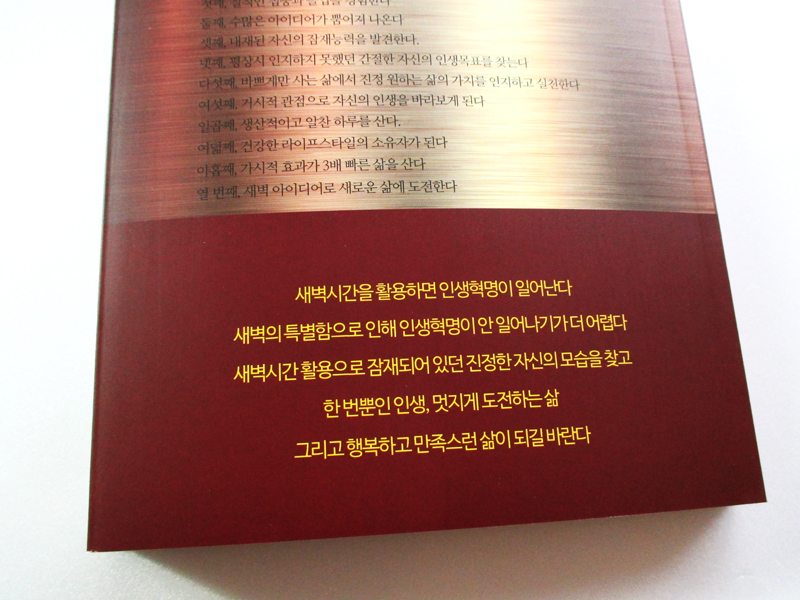 작가는 새벽시간 활용으로 새로운 삶을 살게 되었다고 한다. 새벽시간에는 시간과 다른 특별함이 있기 때문에 삶이 변화되지 않을 없다고 말한다. 떠오르는 태양처럼 새벽에는 모든 에너지가 새롭게 충만해 진다. 만약 낮에 풀리지 않고 고민한 문제가 있다면 새벽에는 문제의 해결 실마리를 의외로 쉽게 찾을 있다. 에너지가 충만한 만큼 많은 아이디어를 얻을 있기 때문이다. 또한 집중과 몰입이 쉬워 어떤 일을 하더라도 완성도 있는 결과물을 얻을 있다고 한다. 그래서 작가는 새벽독서 5 만에 몰입독서를 통해 의식의 변화를 체험했고 쓰기에도 도전해서 《하루 한권 독서법》이란 인생 개인 저서도 출간하게 되었다.