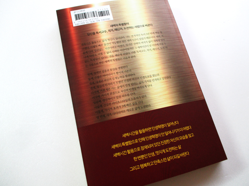 마흔이 넘어 뒤늦게 시작한 출산과 육아로 책을 읽기 시작했다. 새벽시간을 주로 활용하여 1 만에 육아서 200 이상을 집중적으로 읽었으며 육아서 이후 다른 주제를 다양하게 읽고 배우면서 출간에 대한 아이디어를 얻어 본격적인 독서 5 만에 인생 책을 출간했다. 작가는 모든 성과가 집중과 몰입의 시간, 새벽시간의 활용에 있다고 이야기한다.
