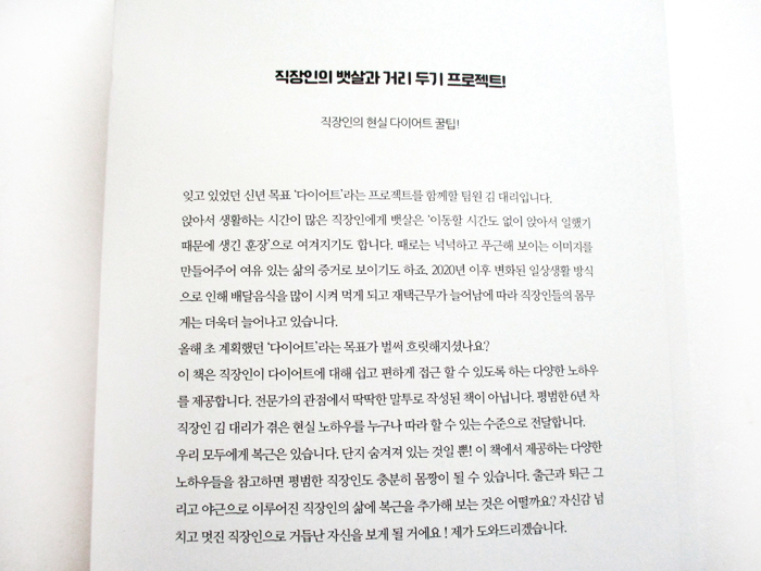 이 책에는 저자가 2018년부터 건강한 몸을 만들기 위해 다이어트 식단과 운동을 병행하면서 터득한 모든 실전 노하우가 수록되어있다. 특히 바쁜 직장생활 중에도 건강한 몸매를 유지할 수 있도록 하는 지극히 현실적인 팁들을 다수 알려주고 있다.