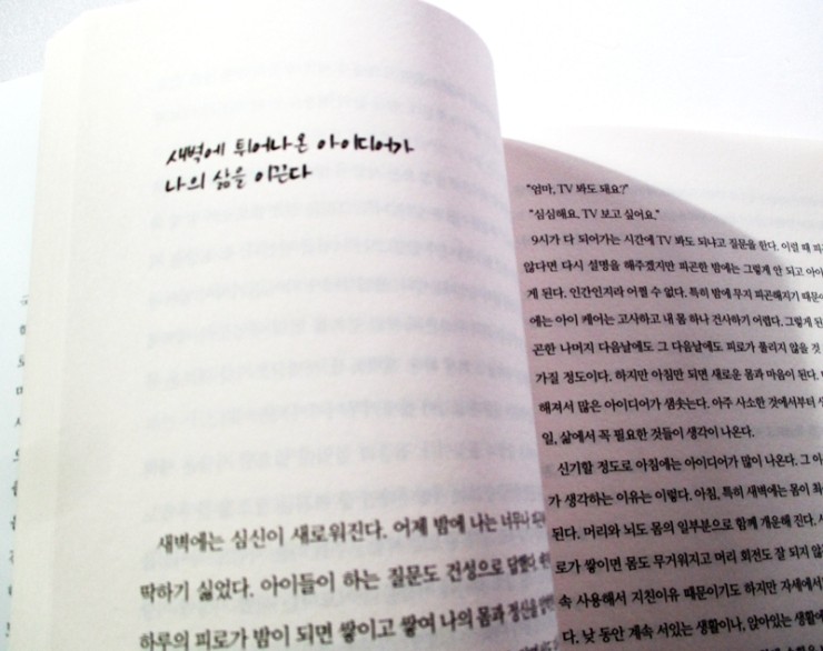 하지만 새벽시간을 활용해야 할 피치 못할 상황이 발생했다. 그것은 독서의 매력에 뒤늦게 빠졌다는 것이다. 원래부터 책을 즐겨 읽는 사람은 아니었지만 육아를 하면서 책을 읽기 시작했다고 직장 맘으로서 독서를 사랑하게 되었다. 하지만 도저히 시간을 낼 수가 없어서 새벽시간을 활용하게 되었다. 그때도 작가는 고민을 많이 했다. 잠에 특별한 의미와 가치를 두고 있던 작가에게 잠을 줄이고 새벽시간을 활용한다는 결정은 아주 힘든 결정이었다. 그래도 독서에 대한 열정으로 새벽시간을 활용하게 되었다.