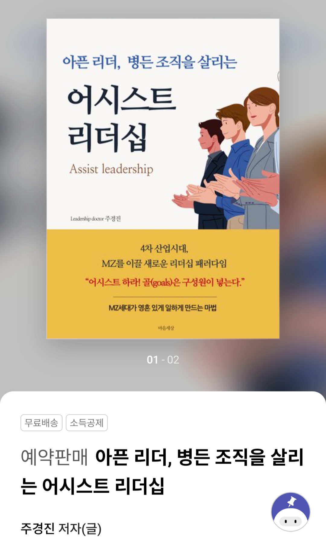 예약판매 어시스트 리더십 교보문고 예약판매중 https://product.kyobobook.co.kr/detail/S000214182495 아픈 리더, 병든 조직을 살리는 어시스트 리더십 | 주경진 - 교보문고아픈 리더, 병든 조직을 살리는 어시스트 리더십 | MZ세대가 영혼 있게 일하게 만드는 마법 병든 조직을 일으켜 세우는 리더십 닥터가 속 시원히 알려 준다. 시대의 두 화두 ‘4차 산업’과 ‘MZ구product.kyobobook.co.kr 책 2024.09.07